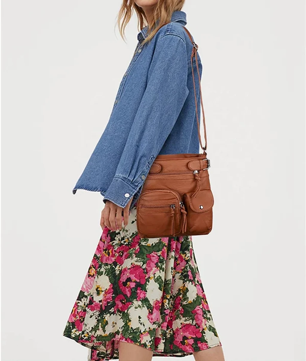- This uniquely designed handbag is one of a kind, It has a "washed" look and features an adjustable belt strap for the perfect fit based on your height. The outside has three zippers and an accessory pouch. The inside of the bag is wide open with an inside zipper, accessory pocket, and back zipper.